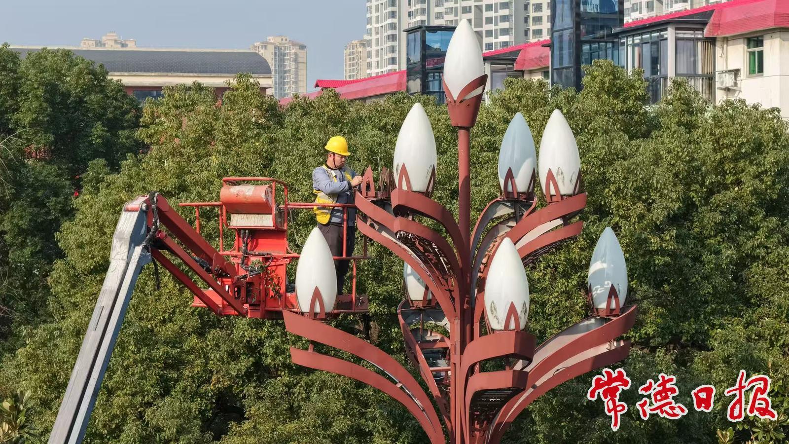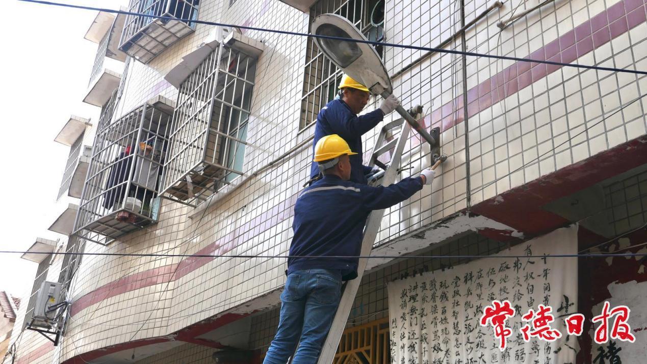 工作人员在惠家坪社区更换灯具城市夜间景观品质同步提档升级。常德河街周边亮化改造全面完工,七里桥更新防眩护栏路灯,穿紫河南岸增设立体照明与艺术灯具,形成一条光影交织的夜间景观带。春节期间,武陵大道、常德河街等重点区域悬挂各类主题灯饰上万组,营造了喜庆祥和的节日氛围。