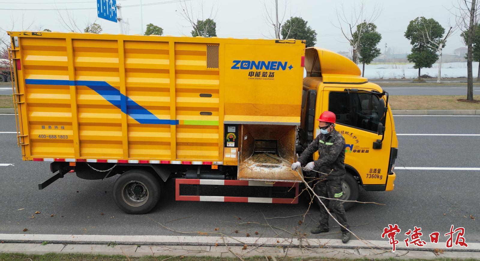 园林工人对修剪的树枝进行清理