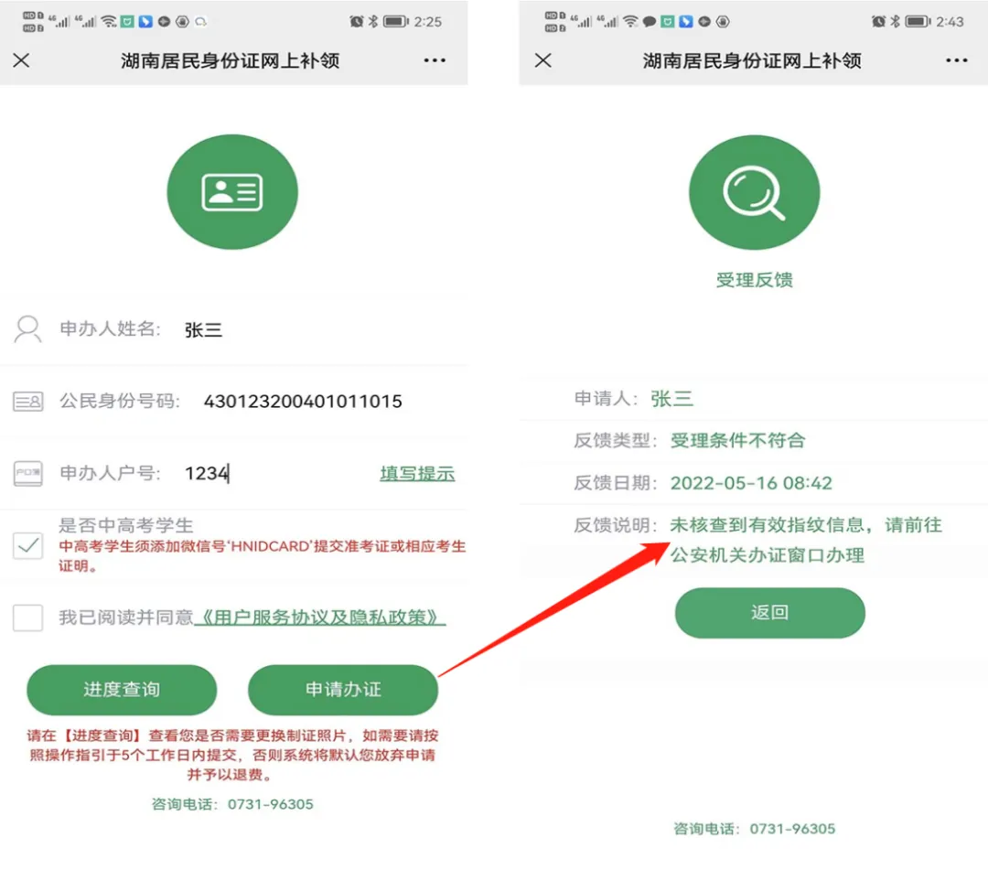 若申请人在我省未办理登记指纹的居民身份证,系统会提示申请人前往公安机关窗口办理(如下图)。